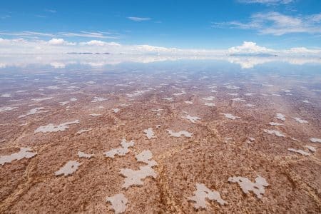 O Salar de Uyuni, por sua vez, é um oceano imóvel de sal cristalino, vasto como um sonho sem fronteiras. Remanescente de antigos lagos pré-históricos, sua superfície branca se estende até onde a vista não alcança, desenhando geometrias perfeitas sob o sol andino. Durante a estação úmida, uma fina camada de água transforma o salar em um espelho celestial, onde céu e terra se fundem em uma ilusão quase mística — horizonte dissolvido, realidade suspensa, infinito em silêncio.